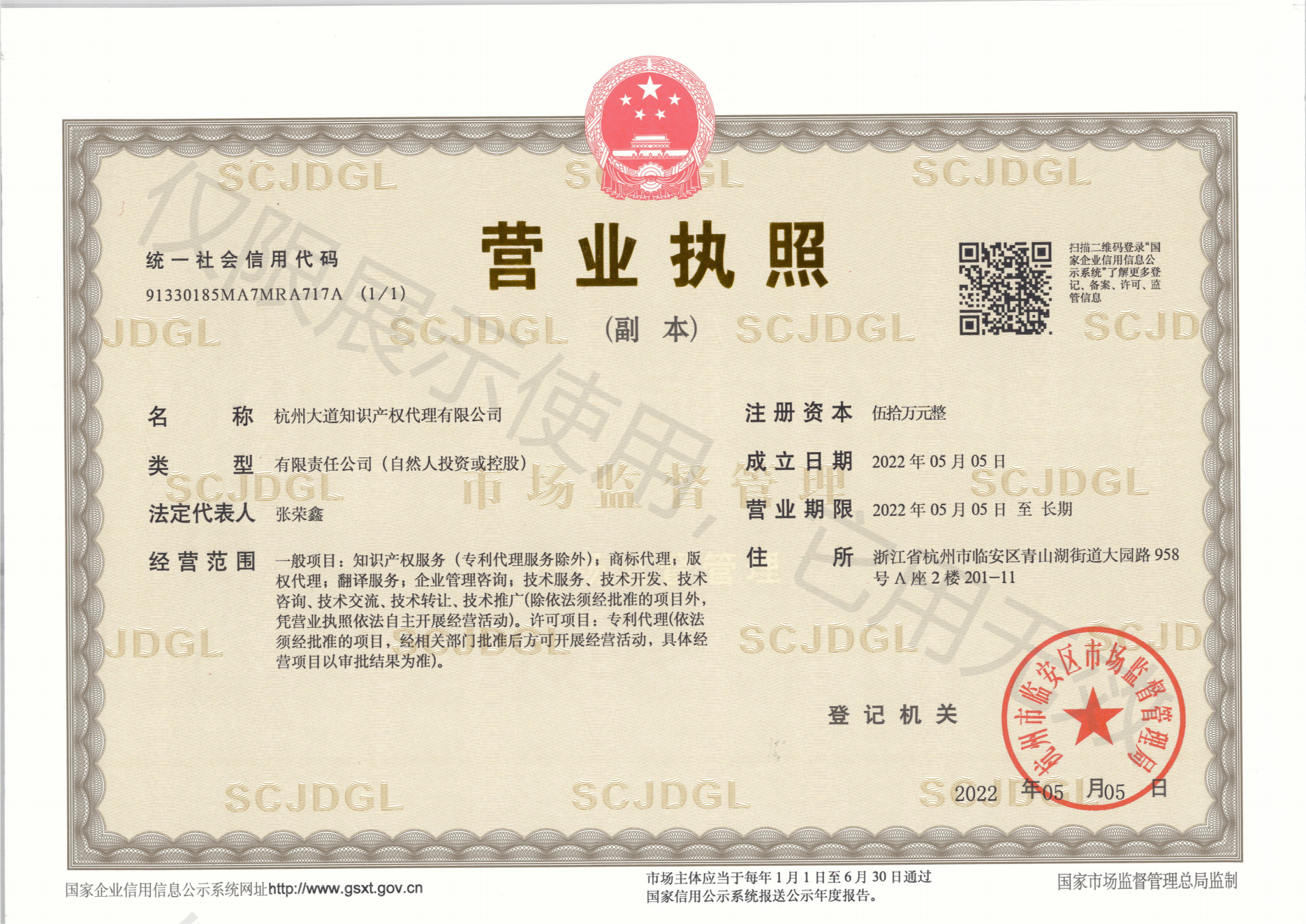杭州大道知识产权代理有限公司,是由国家知识产权局依法批准设立的专业知识产权服务机构,公司服务团队由行业资深专利代理师、商标代理师、专利检索分析师、知识产权师、商标设计策划师组成,专业覆盖:机械、电子、化工、材料、牛物、医药、美术、设计等领域,具有深厚的法律理论基础和知识产权事务办案丰富实操经验,为客户提供包括国内外专利申请、商标注册、知识产权维权、知识产权运营等各种知识产权相关服务,服务内容涵盖企业生长全周期,助力企业品牌提升。 公司精益求精、不断健全完善各项知识产权代理事务的质量审核和流程管理体系,进一步保障服务质量,为客户提供咨询、获权、管理、运营、维权等全流程知识产权解决方案,增值客户智慧财富,提升市场竞争力。 公司秉承“追求卓越,用心服务”的服务理念,竭诚为客户提供优质、高效的知识产权全产业链专业服务